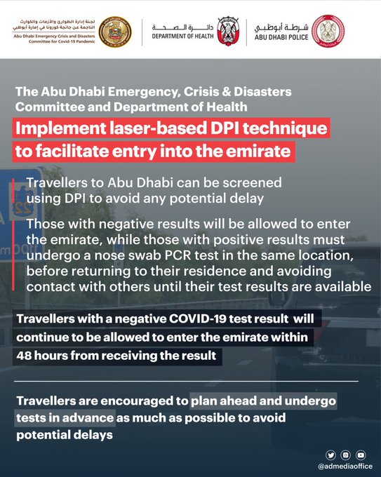 මේ වන තෙක් ඩුබායි සිට අබුඩාබි බලා යාමට කැමති ඕනෑම කෙනෙකුට ඔවුන්ගේ ගමනට පෙර ගන්නා ලද negative කිරීටක වෛරස් පරීක්ෂණයක සාක්ෂි පෙන්විය යුතුය.